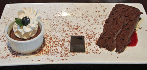 16 August 2013:Could there possibly be a more appropriate name for a triumvirate of chocolate decadence than chocolate decadence trio? It’s a no brainer. If you’re a bonafide chocoholic, having this dessert is also a no brainer. Quite simply, it lives up to its name. The chili (SIC) lime chocolate pot’s du creme has the type of heat which hits the back of your throat coupled with the rich, adult chocolate to generate an endorphin rush. A sole peanut butter truffle, the coupling of two great tastes (chocolate and peanut butter) that taste great together will have you wishing for a bowlful. The flourless chocolate torte with strikes of raspberry sauce is dense and intensely flavored with adult chocolate notes. This is the type of chocolate dessert that provides the same “high” as falling in love. You’ll certainly fall in love with this dessert