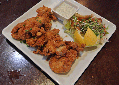 16 August 2013: Hearing that one of the specials of the night was Cajun style oysters led to some trepidation. Oysters, after all, have one of nature’s most unique flavors (albeit one that doesn’t appeal to all diners). A heavy hand with Cajun seasoning–or worse, blackening techniques–could bring ruin to those flavors. Thankfully Chef Kevin knows oysters are to be treated with utmost subtlety and delicateness. The oysters are lightly seasoned which allows their natural brininess to shine. The zingy, but certainly not overwhelming, Cajun personality comes from the accompanying Remoulade sauce. During our visit, the oysters shared the plate with a cold, peanuty noodle salad, likely Thai inspired.