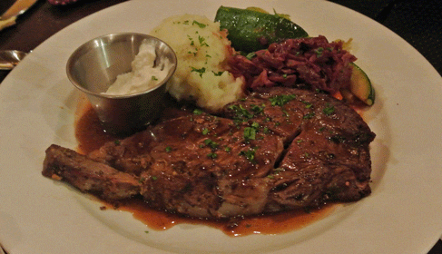 24 January 2014: One of the most popular of “cold weather dishes” on the Blades’ menu is roasted prime rib served with au jus and horseradish sauce. The prime rib, as with all meats we’ve enjoyed at Blades’ is outstanding: rosy colored and bursting with copious juices flowing at medium rare, devoid of excess fat though nicely marbled and with a nice concentration of deep fresh-roasted flavors. At about twelve ounces it’s “right-sized” slab of beauteous beef, one of the very best we’ve had in New Mexico. The prime rib is served with garlicky mashed potatoes, sauteed vegetables and a sweet, tart and sour red German cabbage as good as you’ll find at any German restaurant.