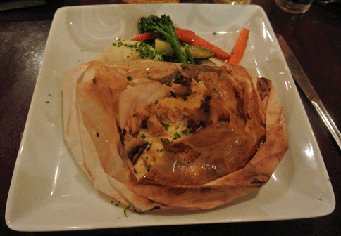 24 January 2014: Yet another way in which Blades’ showcases sole, a flat fish member of the extended flounder family, is as Dover Sole En Papillote, a classic marriage of British and French cuisine. “En Papillote” is a method of baking fish within sealed parchment paper which creates a self contained mini “oven” in which the flavors blend and infuse the dish. Because the parchment paper is porous, it allows steam to escape so the fish is baked rather than steamed. The British contribution to this dish is the Dover sole itself. Found in the waters below the Cliffs of Dover, this sole is sometimes considered the “Porterhouse of fish” and is one of the most delicious fish, cherished and beloved by gourmets who love fish. Chef Bladergroen’s rendition of Dover Sole is as good as we remember the Dover Sole we enjoyed in England.