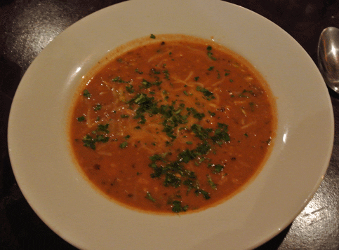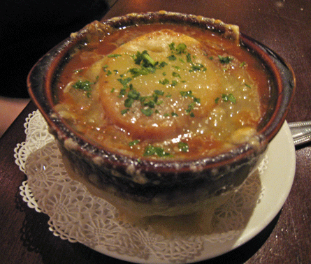 23 February 2012: The only sane reason for which you should forgo an appetizer is if you’re going to luxuriate in one of the chef’s wondrous soups. The French onion soup is among the most aesthetically appealing and delicious of its genre in New Mexico. Served in a traditional two-tone soup crock, it arrives at your table steaming hot with the cheese brown and bubbling over the top of the crock. The aroma of onions is intoxicating and the broth is thicker than most French onion soups. The onions are cut larger, too, imparting the wonderful sweet flavor of perfectly prepared onions. You’ll risk the molten cheese and sacrifice the roof of your mouth to dig into this soup right away.