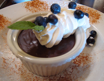17 December 2011: In the June, 2010 edition of New Mexico Magazine celebrating “New Mexico’s Best Eats,” a three person panel of culinary experts of which I was a part, selected as the Land of Enchantment’s best uptown dessert, the red chile soup at La Casa Sena. Studded with Chimayo chile that enlivens the chocolate, it is one of my favorite desserts. In the Chocolate Chili Pot, Blades’ Bistro may have one-upped La Casa Sena. The chocolate chili (sic) pot is a ramekin brimming with dark chocolate pots du creme with toasted Chimayo chili. Its consistency is reminiscent of a very thick frosting served cold, but it certainly doesn’t taste like the topping for a cake. The adult chocolate is made even more flavorful with the infusion of Chimayo chile (better, by the way, than Hatch chile). It’s topped with whipped cream studded with blueberries.