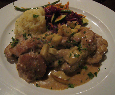 My friend Larry McGoldrick, the professor with the perspicacious palate, is a sweetbread savant, enjoying them so much he once had them every other week for six straight months at Chicago’s La Grenouille. When he compared Blades’ version to the one he enjoyed so much in the Windy City, I knew I had to try them, gout be damned (purine rich sweetbreads top the list of things gout sufferers should avoid). What’s a little joint pain and threat of kidney stones compared to the decadent deliciousness of great sweetbreads. Blades’ sweetbreads are outstanding–pan-seared, fork-tender veal sweetbreads in a rich, creamy Calvados brandy sauce perfumed ever so slightly with sweet, delicate apples. Texturally they’re absolutely perfect and flavor-wise, they’re incomparable. The sweetbreads are served with mashed potatoes and a salad of julienned carrots and red cabbage, a good counterpoint to the richness of the sweetbreads.