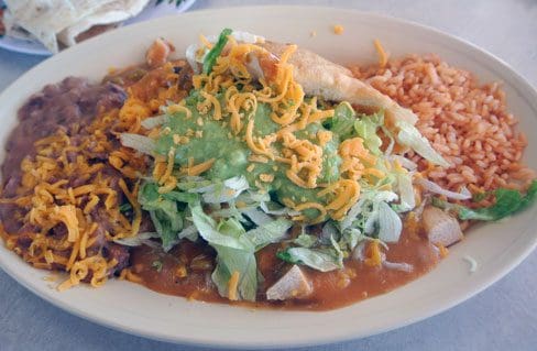 Three stuffed sopaipilla plates are available including one called simply “stuffed sopaipilla.” Stuffed means engorged with chicken or carne desebrada, lettuce, cheese, guacamole, pico de gallo and green chili (sic). The chicken is mostly white meat cut into small cubes. The guacamole is some of the very best in Albuquerque, so good it may prompt you to order guacamole on the side, too. Alas, the chile is rather insipid with absolutely no discernible bite. Its saving grace is that it has a very pleasant flavor. Both the rice (moist, but not tomatoey) and the refried beans are excellent.