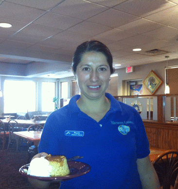 Colorful murals of the bounty of the sea festoon the walls. Under glass in each table are hand-drawn prints of the trappings of Aztec life–molcajetes for grinding corn, platters of fish, and more. Even the menu is colorful–as in vivid plastic menus complete with photographs of the entrees with descriptions in both English and Spanish. You’ll be well attended by a very accommodating wait staff almost as fluid in English as they are in Spanish. Some, such as Margarita (pictured far below) are so friendly and helpful that you might be tempted to ask them to join you at your table.