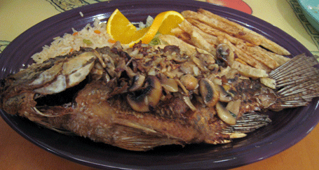 Pescatorian delights include mojarra served several different ways. Mojarra, a prominent fish on mariscos menus throughout Latin American, is a name given various species of fish, including tilapia. At Mariscos Altamar, the mojarra is served whole–head to tail–and is deeply (maybe overly so) fried. The garlic mojarra with mushrooms is crisp and a bit dry on the outside, but penetrate that gruff exterior with a fork and you’re rewarded with a firm-fleshed white fish complemented very well by the garlic-mushroom topping (which would be even better using freshly chopped garlic instead of minced garlic out of a jar). This dish is served with French fries (accompanied by cold ketchup) and rice.
