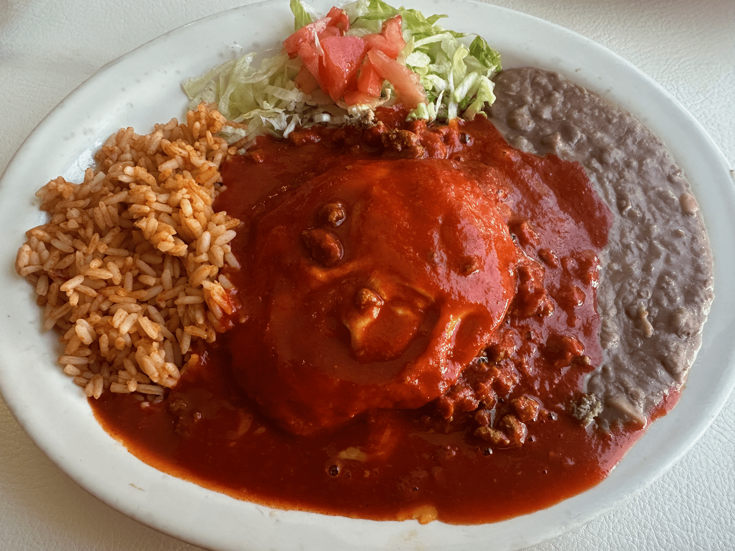 Absoutely delicious. The red chile is absolutely delicious. Pure, fresh, unadulterated, piquant and flavorful. The heat not only caused a few beads of sweat on my brow, but seemed to open up the pores in my tongue (if my tongue has pores) so that the exquisite chile flavor came fully through. I had beef enchiladas and asked for lots of “red” and got lots of “red.” It nearly covered the rice and beans as well as the (flat) enchiladas, which was exactly what I wanted.