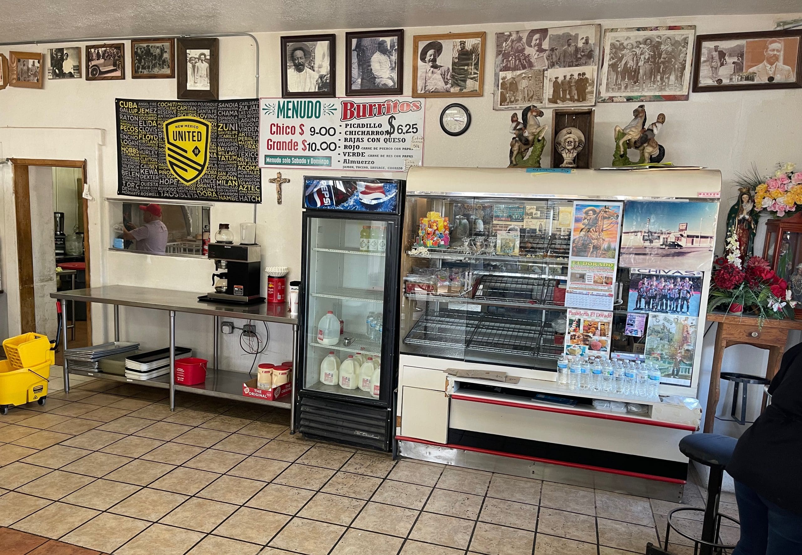 My husband and I finally made it to this dive. We ordered burritos, one with green chile, one with red. The waitress got really confused when we asked to smother the chile sauce on both burritos. She said they put chiles inside the burritos, and don’t smother at all, so we begged to smother. Anyway, it tasted great, but I was surprised the red chile sauce has meat in it, never had such a red chile sauce. There are so many different kinds of pastries, all very airy and sort of dry side. Good for dipping in coffee maybe.