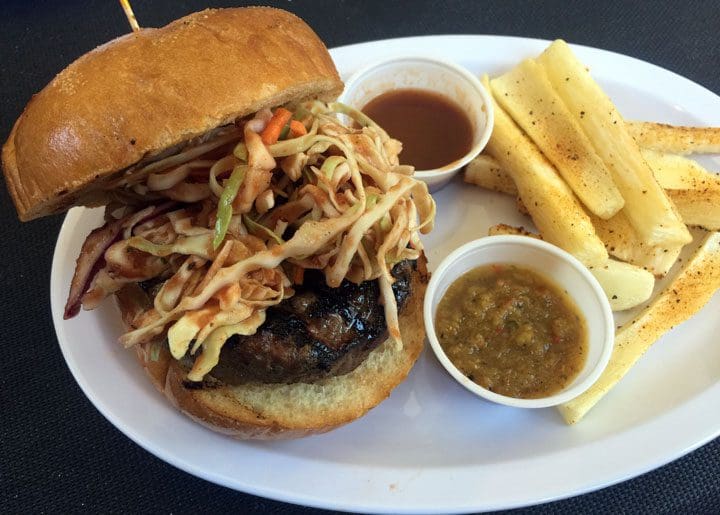 26 June 2018: After a forced two-year abstinence from Safari Grill’s beauteous burgers, I deferred to Shaina’s expertise as to which burger to order. Her highest recommendation was for the eponymous Safari Burger (fresh herbs and spices infused in a ground beef patty and chargrilled to perfection served with lettuce, tomato, onion, ketchup, mustard or mayo on request). She recommended having it “Safari Style” which means a haystack sized topping of coleslaw. Sides of Safari Grill’s wondrous tamarind sauce and a green chile salsa also accompanied the burger as well as an order of cassava fries. The burger was everything I remember it being though I made a mess of it by using up all the tamarind sauce and salsa. The chargrilled ground beef patty is thick, at least eight ounces. All beef patties should be seasoned this well. All burgers should be this good!