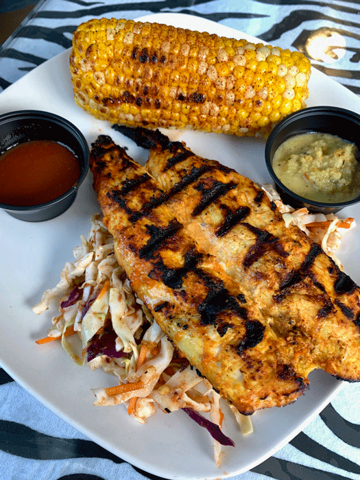 7 August 2019: Though it was originally conceived in, of all places, Glasgow, Scotland, chicken tikka masala is one of the most popular Indian dishes in the world. The creamy tomato-and-chicken curry dish is so esteemed that many diners don’t realize its progenitor was actually chicken tikka, literally small chunks of boneless chicken. The Safari Grill describes its chicken tikka as “a juicy, succulent full of flavor chicken breast chargrilled and served atop the house slaw with a roasted corn-on-the-cob.” My friend Bruce “Sr. Plata” Silver describes it as absolutely delicious. Readers of Gil’s Thrilling… might recall how your humble blogger considers chicken “the most boring of all proteins.” That description doesn’t apply to the chicken tikka at the Safari Grill. Chef Young manages to seal in moistness in the chicken breast, characteristically the most bland and desiccated portion of the chicken. Moreover he imbues the chicken breast with the incomparable flavors of Indian spices coupled with the smokiness of the chargrilling process.