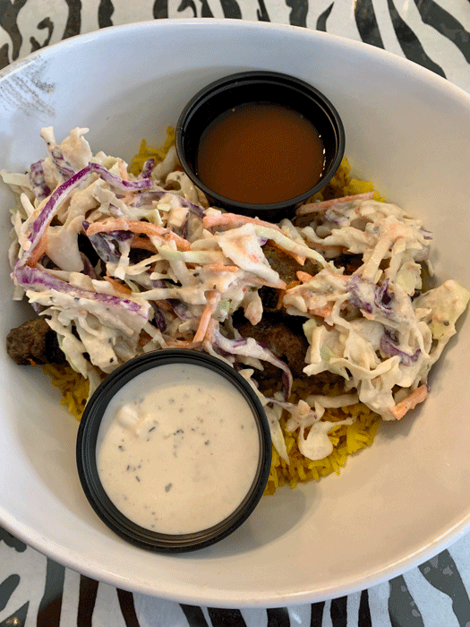 Only a photo safari in Tanzania could possibly offer you as much versatility as Safari Grill’s “Build Your Own Adventure.” As much fun as it is to eat one of these paragons of delicious diversity, those of us for whom changing our minds is a prerogative may find it quite a challenge to decide what combination to enjoy. Fortunately the perpetually smiling Shaina has the patience of a saint and the wisdom of Solomon. Let her be your guide on your adventure. My inaugural adventure was in the form of a bowl with the lamb and beef, coleslaw and two sauces tamarind chutney and cool cucumber sauce. The cool cucumber sauce, of course, is a natural Middle Eastern inspired pairing with the lamb and beef amalgam which certainly will remind you of your favorite seasoned kebab. Prepared at about a medium degree of doneness, the lamb and beef amalgam is absolutely delicious. Safari Grill procures its lamb from Keller’s Farm Store in Albuquerque. It’s a high quality lamb as denizens of the Duke City know. My adventure was amazing!