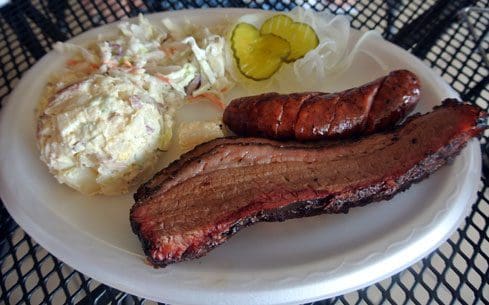 The menu is relatively small. Meats–sliced brisket, chopped brisket, Elgin sausage (regular or “hot”), pork spare ribs and pulled pork–are available by the half-pound. Sandwiches and plates are also available. Sides include Texas pinto beans, coleslaw, fresh-cut fries, mac and cheese and bacon potato salad. Your best bet is a combination plate, your choice of any two meats served with two sides. Plates include sweet Vidalia onions, pickles and slices of white bread (often considered a veggie in barbecue circles).