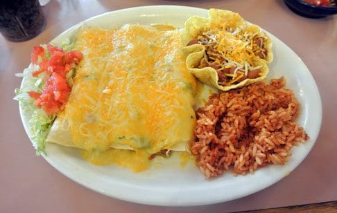 Though tepid by New Mexican standards, the curiously named Pack’s Green Chile Enchiladas might be a bit too incendiary for out-of-state visitors. This entree features three rolled enchiladas stuffed with shredded chicken, cheese and sour cream then topped with shredded cheese. We found the cheese-sour cream amalgam somewhat gloppy, reminiscent of the melted cheese used at ballparks on nachos. The highlight of this entree is easily the beans which are served in a hard corn shell shaped like a bowl. The nearby Estancia Valley grows the very best frijoles (pinto beans) in the country and they’re available at El Comedor.