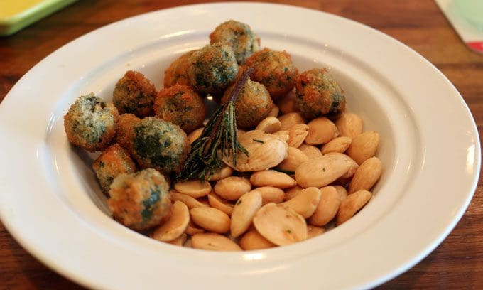 10 September 2016: The “snacks” portion of the menu includes several items bordering on irresistible. Two print-based restaurant reviews predating mine raved about the fried rosemary Castelvetrano olives and roasted Marcona almonds. There’s a good reason for that. Imported from Castelvetrano, Sicily, the green-hued (the color of Kermit the Frog) olives lack the bitterness of most olives and are actually considered dolce (sweet) in Italy. Loyal Hound coats them in a light rosemary-imbued batter and fries them, not to the point that they’re crispy or stiff. Bite into them and you’ll find the olives refreshingly fresh and juicy.