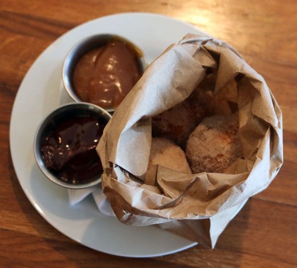 10 September 2016: Cafe Du Monde in New Orleans made its reputation largely on the strength of chicory coffee and beignets, a square piece of dough, fried and covered with powdered sugar. Locals find it humorous to see tourists walking around with more than a dusting of powdered sugar on their clothing. As often as we had these fried fritters, we never thought them to be as good as sopaipillas. The cinnamon-sugar beignets at the Loyal Hound are close. Served three to an order in an old-fashioned paper bag (called a Doggy Bag), the beignets are more roundish than the traditional New Orleans-style beignets, more closely resembling oversized donut holes. They’re also served with your choice (or both) of dipping sauces, either sea salt caramel or ganache. The dipping sauces elevate the beignets significantly.