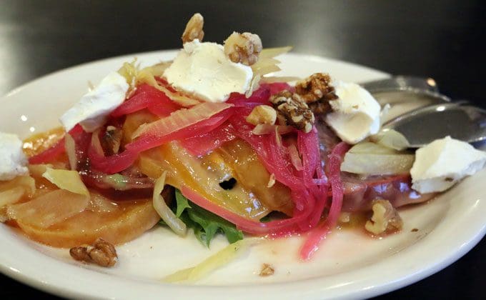 29 July 2016: Another of the aforementioned foods of my wasted youth are beets which novelist Tom Robbins described as “the most intense of vegetables.” As a child, beets ranked with spinach and verdolagas (purslane) as vegetables to be feared and loathed. Beets were so awful not even our omnivorous scrounging dogs would eat them. In my estimation as an adult, beets can’t be beat. They’re among my favorite vegetables. Only at the phenomenal Blade’s Bistro in Placitas have we had beets as good as the Barabietola (beets, tomato, pickled fennel and red onion, goat cheese, walnuts) at Piatanzi. Your taste buds will do a happy dance over the melange of flavors while your sense of esthetics will appreciate the sheer beauty of this dish…and if you’ve never had yellow beets, you’re in for a treat. Paired with goat cheese, they’re spectacular.