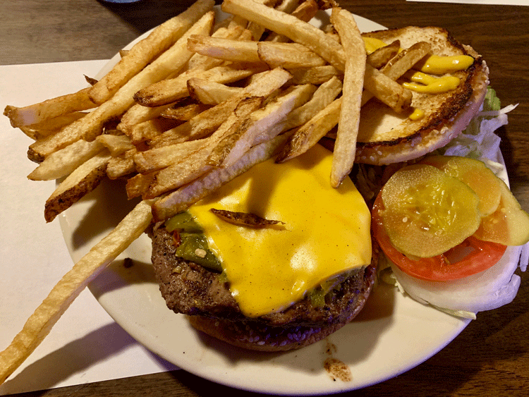 24 August 2023: The charbroiled Monte Carlo Burger with green chile and cheese (by any name a green chile cheeseburger) is an exemplar for how this most sacrosanct of New Mexico’s great burgers should be prepared. There are too many green chile cheeseburgers in which green chile barely registers on the Scoville scale with about as much piquancy as a bell pepper. The Monte Carlo’s green chile bites back with a pleasant piquancy heat lovers will respect. What really sets this cheeseburger apart, however, is the freshness and moistness of the beef patty which is essentially ground steak, a thick third-pound of beef prepared to your exacting specifications. Our friends John and Lynn have fallen in love with this burger, rating it even higher than they do the legendary Bobcat Bite’s world renowned burger. Lynn likes it so much that she passed on the nine-ounce filet, her previous favorite item at the Monte Carlo. John calls Monte Carlo “the full Monte.” He loves the burger, too.