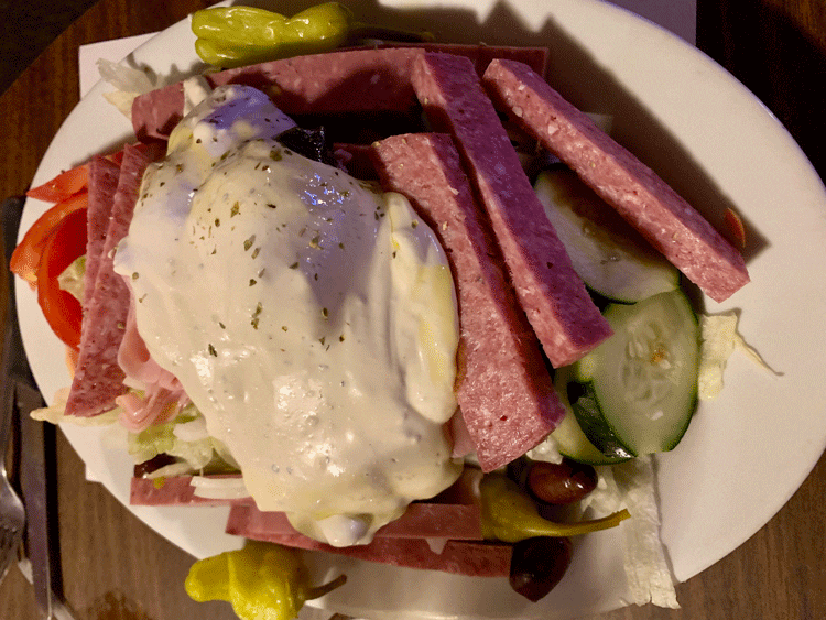 All of the appetizers looked appealing. Knowing that Greek was their second language after steak, we started with the Greek appetizer plate. It was a simple but satisfying charcuterie with various salamis, olives, cucumbers, tomato wedges, hot peppers and a huge slab of delicious feta. Bread would have been a nice addition. We made do with the overflowing basket of saltine crackers. My bacon wrapped filet was perfect. John decided on the Monte Carlo burger with no condiments except green chile and cheese…a GCCB by any other name. It was also pronounced excellent. Both came medium rare, as requested. The potatoes left something to be desired. Not sure what the deal was with my baked potato, but I couldn’t eat the skin which I usually like to do. John claimed his french fries hadn’t been blanched. I found them to be palatable, but they were much better when resurrected in a fry pan the next day at home.