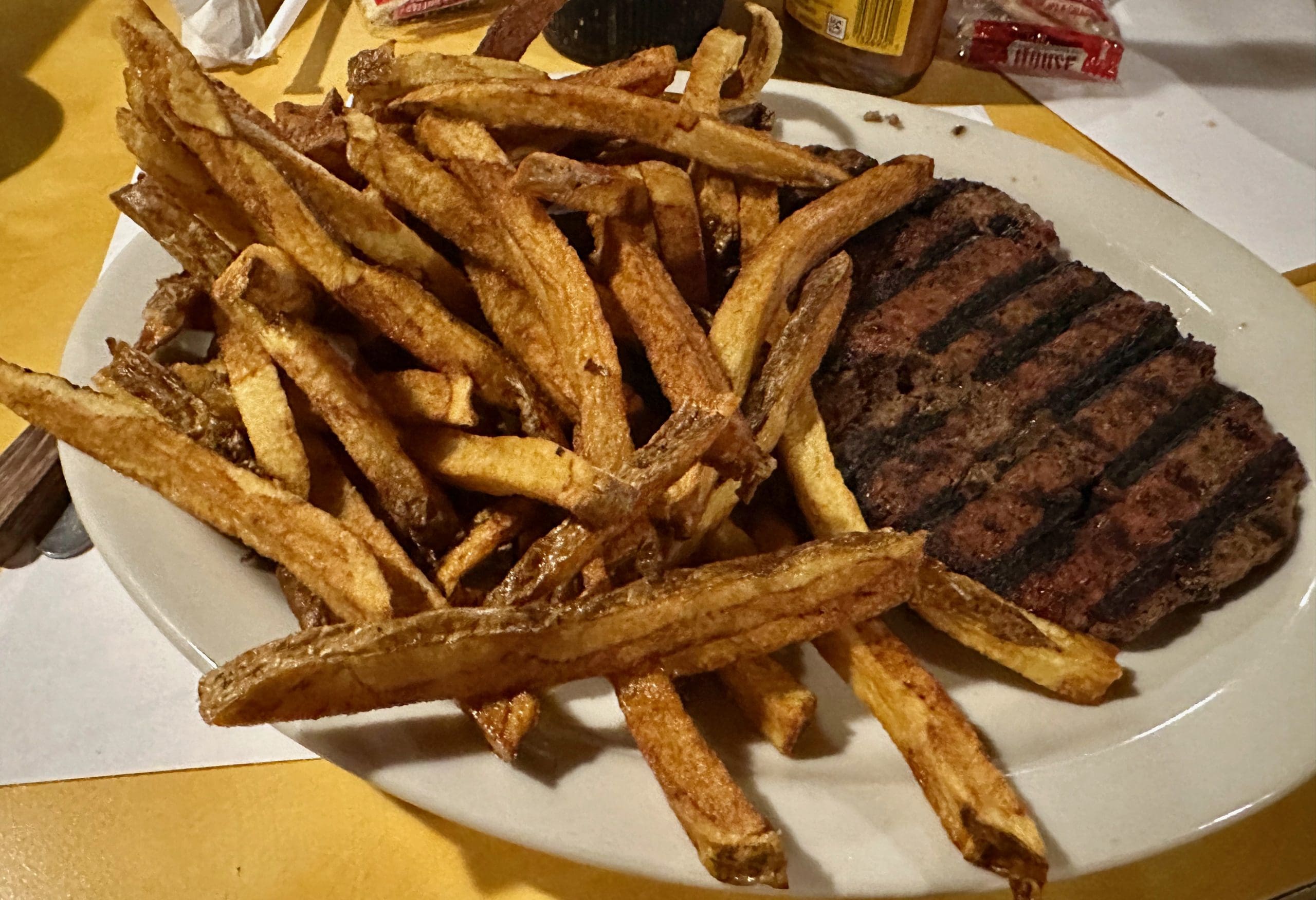 Hi Ruben, Alas, that picture was of my burger steak, and it was as dry as a desert fart. I ordered it cooked medium rare, and it came back well done. I rarely send food back since I don’t like to have food thrown in the trash if I can eat it. While dry and overcooked to my taste, it was still pretty good. The fries were also good. A week later, I had a Green Chile Cheese Burger, and it was outstanding and cooked to a perfect, juicy medium rare with a charcoal crust. The fries, were again great – they obviously use fresh never-frozen potatoes.