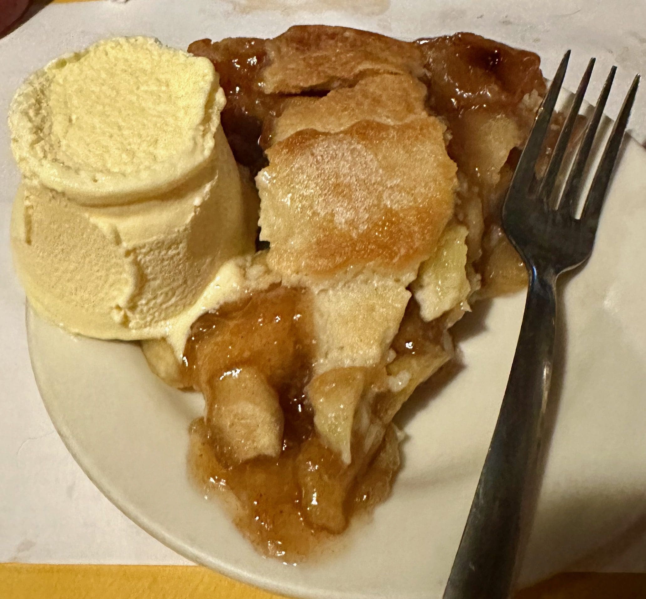 17 August 2023: It wasn’t until this once naive, Spanish only speaking child started school that I ever heard any Spanish invectives and exclamations. One that confused me (and does to this day) is the term “a la modey.” It’s used as an exclamation of surprise or amazement and I suspect is based on “a la mode,” the North American term for “served with ice cream.” Both “a la mode” and “a la modey” are appropriate when you order Monte Carlo’s apple pie a la mode. It’s literally bursting at the seams with apples. A crumbly crust provides a savory complement to the sweet, juicy apples. If you’ve got room left after a bounteous meal at Monte Carlo, this is one dessert you can’t pass up.