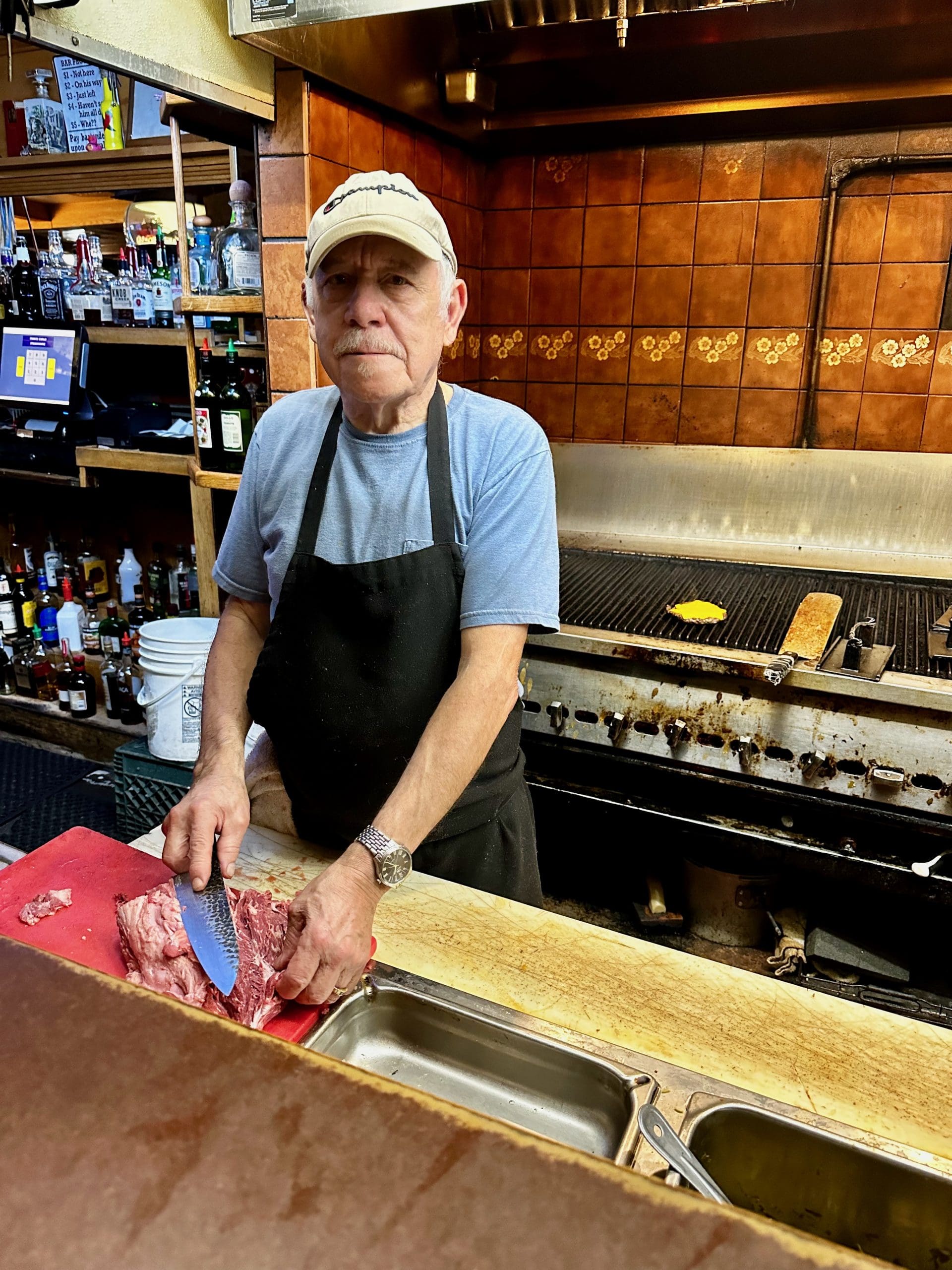 Monte Carlo’s indisputable, indispensable, most valuable employee is Frank who’s been manning the grill since 1990. That’s 33 years of making people happy. Frank hand-cuts every single steak and grinds steak into the famous and fabulous Monte Carlo burger. You might see other employees in the grill area, but it’s Frank who does all the hard work. He doesn’t ever seem to take a break or slow down. That’s because the volume of guests asking for his steaks and burgers is pretty heavy during peak hours. Modest almost to a fault, Frank is reserved about compliments. When Sarita and I visited his station to praise him on our burgers he accepted our thanks with humility and kindness, but wouldn’t talk much about himself.