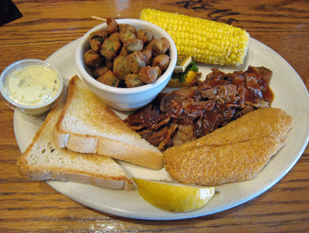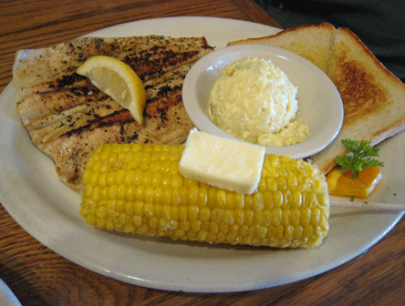 1 July 2011: Much better is an entree of broiled trout which is as tender and moist as the catfish is tough and dry. Two delicious filets are served with two sides and Texas Toast. The filets are brushed lightly with butter and served with a nice char. A squeeze of lemon or a small application of tartar sauce and you’re good to go. The only drawback to eating broiled fish, no matter how good it may be, is being surrounded by the fragrant bouquet of bodacious barbecue. You may want some of Powdrell’s barbecue sauce on the trout, too.