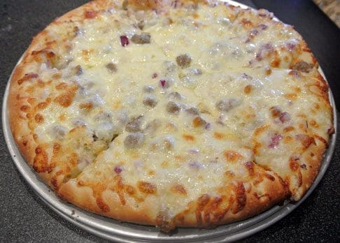 Though not a sports fan (save for a drive-by interest in the Chicago Bears…when they’re winning), my Kim didn’t feel completely out of place at Gioco though she didn’t understand why our server wouldn’t change the channel to the Food Network (isn’t Iron Chef a sport?). We were both lamenting the fact that we hadn’t had a good pizza in four months (not even in California) so she ignored all the football games on the televisions. Her “build your own” pizza was constructed with a garlic oil sauce, sausage and cheese. It was a bit rich for me and the garlic sauce was powerful enough to ward off a family of vampires (or any amorous prospects), but it just right for her.