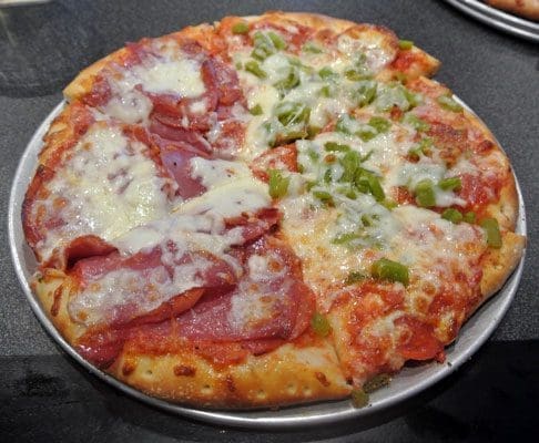 The crust is a perfect canvas for the “have it my way” custom pizza I ordered. The Salumeria (pepperoni, Genoa salami, spicy capicola, Parmesan and Mozzarella with a classic pizza sauce) occupied half the pizza. The other half was pepperoni and green chile. This is a perfect combination! Not unexpectedly considering the salted cured meats from which it is constructed, the Salumeria is a bit on the salty side, but those meats (especially the spicy capicola) are plentiful and they’re macho meats. Alas, the green chile was a bit on the insipid (like Eli Manning) side, lacking the eye-watering, tongue-blistering heat men (at least New Mexican men) love.