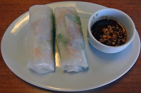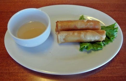 There are fewer than fifty items on the food menu including a limited number of appetizers and several vegetarian options. The most popular starters are egg rolls and spring rolls. The egg rolls are tightly-packed, golden-hued rolls stuffed mostly with vegetables and served with a clear fish sauce for dipping. Translucent rice paper wrappers envelop vermicelli noodles and vegetables on the spring rolls which are served with a Hoisin and peanut sauce.