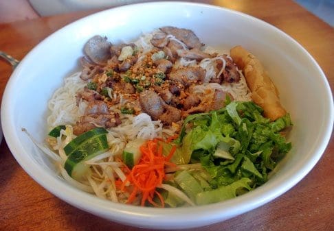One of the most popular noodle entrees on the menu is vermicelli which you can order with tofu or with pork and egg roll. It’s interesting that in Italian “vermicelli” translates to English as “little worms.” While that doesn’t sound especially appetizing, vermicelli in the hands of a Vietnamese chef is a delicious combination of long and thin pasta, julienne carrots and daikon, cucumbers, lettuce, crushed peanuts and fish sauce added to taste. The pork should have the characteristic sweet and savory grilled flavor that makes Vietnamese style pork a very special entree. At Viet Noodle, the grilled flavor just doesn’t come through. The pork has sweet and savory notes, but without the grilled influence, there’s nothing special or memorable about the dish.
