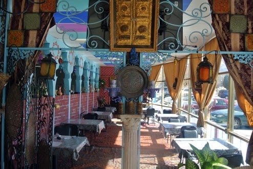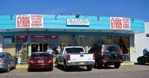 Named for the character in Ali Baba and the Forty Thieves, Ali Baba is located next door to the Red Rock Deli on Lomas just west of Tramway. Signage indicates it’s a food mart and indeed, about half of the store’s real estate is devoted to comestibles. The other half houses a very charming, ornately decorated dining room unlike any in Albuquerque. It’s a magnificent milieu for dining on the restaurant specialties, some listed on the storefront signage: gyros, baba ghanoush, falafel, kabab, hummus, tabooli, fattoush and more.
