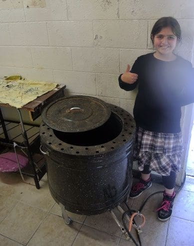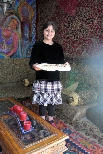 Arabian bread is baked in a small back room. A cylindrical metal oven operates very similarly to the tandoor clay ovens of India in baking large flat bread more closely resembling Indian naan (about the size of a pizza) than Greek pita. As with tandoor ovens, rolled dough is slapped against the oven wall. Extricating it is a delicate (and sometimes painful) process. The resultant flat bread is wonderful with a pinto-pony char, a chewy texture and an addictive flavor. Mesopotamia, by the way, may have actually invented bread. The oldest known clay oven was excavated about 45 miles south of Baghdad. It dates to 4000 B.C. and was used to make the flat bread which was the progenitor of the bread we enjoyed.