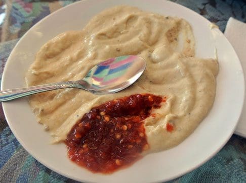 As good as the falafel is the baba ghanoush, a garlicky, smoky roasted eggplant spread popular throughout the Middle East. The melodic name baba ghanoush (fun to say even if you don’t know what it means) has its genesis in an Arabic phrase which translates to “pampered daddy” (not necessarily in a paternal sense). Baba ghanoush is made from grilled eggplant that is mashed and mixed with olive oil, lemon juice, garlic and tahini (a sesame seed paste). Ali Baba serves it with the aforementioned Arabic bread which you’ll dip into the spread and consume lustily. Interestingly, the baba ghanoush is served with a spoonful of chili (similar in heat to Sriracha) which goes well with the dip.