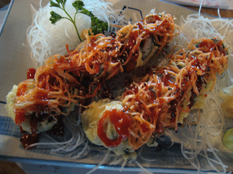 Aficionados of incendiary sushi rolls will find several which will make ordinary humans wish for an asbestos lined mouth. One such tear-inducing roll is appropriately named the 911 Roll. It’s constructed of crab, spicy tuna, jalapeño, cream cheese and spicy crab meat. The cream cheese tempers the heat somewhat. An even more eye-watering mouthful is the green chili (sic) special roll made with crab meat, shrimp tempura inside, spicy tuna and fried chili on top. Both these rolls render wasabi redundant.