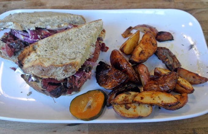 14 December 2014: Pastrami paramours often consider it heretical for pastrami sandwiches to be topped only with a good deli mustard with a dill pickle on the side. Before they become apoplectic at learning M’tucci’s pastrami (made on the premises) sandwich is made with herbed goat cheese, fresh red onions, a housemade mustard on housemade rye, they had darned well better try it. It’s unlike any pastrami this aficionado has ever had and it’s a bit lean (fat is flavor) for my tastes, but it’s still a pretty good sandwich with that herbed goat cheese really standing out. This sandwich pairs well with oven-roasted herbed potatoes, red potatoes seasoned with rosemary, thyme and fresh garlic.