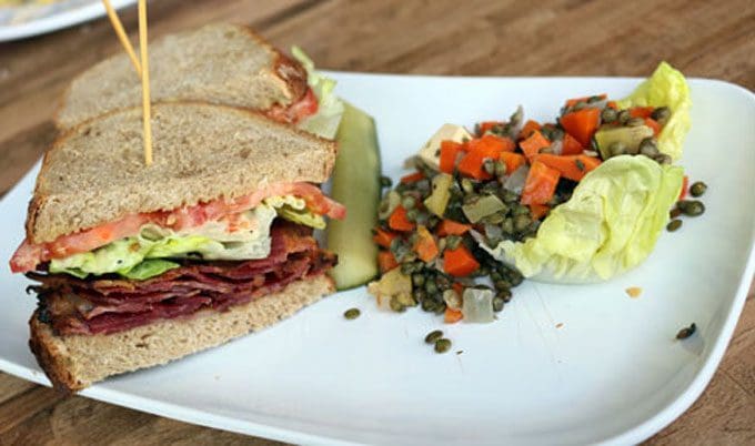 12 April 2015: For years, the benchmark against which I’ve measured all BLTs in New Mexico has been the TBL, a Gecko’s Bar & Tapas original stacked in triplicate with applewood smoked bacon, green leaf lettuce and ripe tomatoes on wheatberry bread. It took more than a decade to find a BLT that’s better. Like the TBL, M’tucci Market’s version is also an original. In its standard form, it, too, is made with applewood smoked bacon though for a mere pittance, you can substitute bourbon-glazed bacon. Splurge! It’s the best bacon we’ve had in New Mexico, better even than the red chile-honey glazed bacon at the Gold Street Caffe. The BLT (butter leaf lettuce, fresh tomato, blue cheese aioli and wheat bread made on the premises) is all a sandwich should be though the hard-crusted bread scrapes against the roof of your mouth just a bit. The blue cheese aioli is rather mild which is perfectly fine because it lets the bacon shine. The lentil salad (pickled onion, carrot, zucchini, rosemary, sage, thyme and Tucumcari gouda) is an excellent accompaniment.