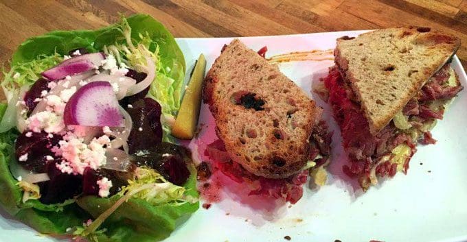 7 June 2016: When she hangs out with Larry and me, Dazzling Deanell is like a delicate flower among two wilted weeds. She not only graces our table with beauty, wit and charm, she always seems to order the right things. Take for example, the Market Reuben (fresh market-cured corned beef, homemade sauerkraut, red chile mostarda on rye bread) she ordered during our June 7th visit. Even as she ordered it, she declared the Reuben at O‘Hare’s Grille and Pub in Rio Rancho to be her favorite Reuben then conceded that M’tucci’s version will probably be even better. She has the gift of prophecy! This is a fantastic Reuben, one she paired with a glorious beet salad. The housemade rye is the perfect canvas for the other components. The red chile mostarda (which has nothing to do with mustard and more closely resembles a relish) is a magnificent blend of fruity sweetness, piquancy and tanginess. As we enjoyed the sandwich, we discerned a flavor similar to cloves (or perhaps crushed lebkuchen, a type of gingerbread spice cookies), but weren’t quite sure what its genesis was. We surmise it may have come from the roasting of the corned beef itself. The corned beef is even better than M’tucci’s pastrami and that’s saying something.