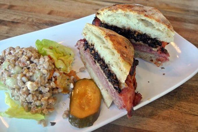 14 December 2014: The sandwich menu includes several familiar favorites such as the Cubano, BLT, Pastrami and Muffaletta, but while M’tucci’s pays homage to traditions which spawned these sacrosanct sandwiches, it does not attempt to duplicate them. The muffaletta, for example, is not an exact replica of the muffaletta you might have at the Central Grocery in New Orleans, but it’s an outstanding Italian inspired sandwich in its own right. The canvas for this superb sandwich is housemade ciabatta which is generously topped with housemade capicola, mortadella, salami, an olive tapenade and house-smoked mozzarella. It takes two hands and a wide-open mouth to handle this mighty, meaty, magnificent sandwich. The yin to the muffaletta is a ferro salad (fresh grape tomatoes, walnuts, Tucumcari feta, pickled red onions on a lettuce leaf), one of the four available sides.