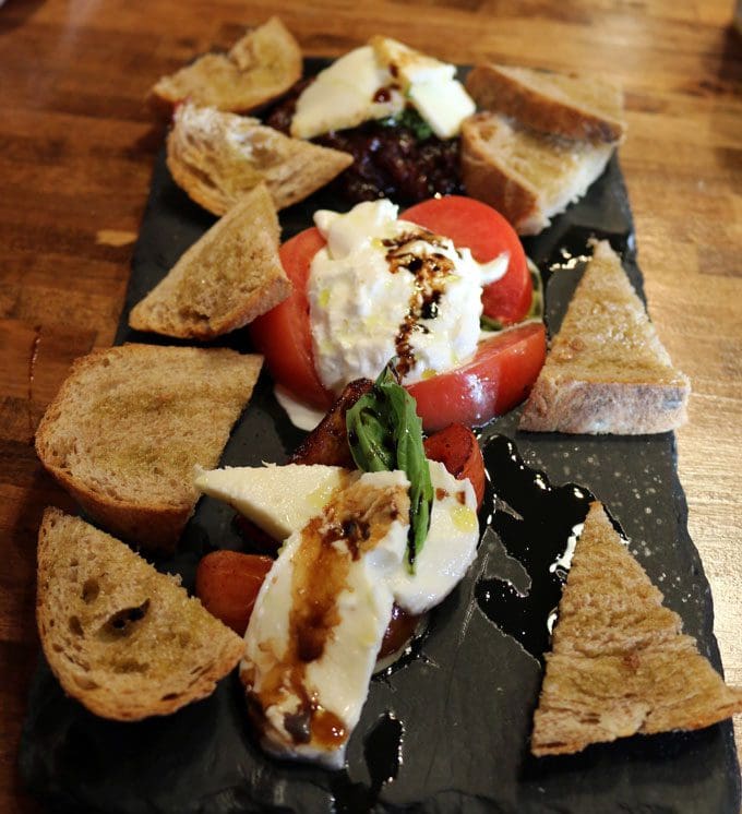 Though listed in the Insalata (salad) section of the menu, the “Caprese Trio” is unlike any composed Caprese salad you’ve ever seen. Served on a slate board is a treasure trove of deliciousness: fresh mozzarella, Balsamic roasted tomato, fresh basil, smoked mozzarella, house Italian tomato jam, pesto, Burrata, fresh tomatoes, basil oil, ten-year old Balsamic vinegar and wedges of lightly toasted bread. It’s sheer genius to compile such individually delicious ingredients into a cohesive array of complementary, harmonious magnificence. Every single component is a shining star. Our favorite may have been the burrata, an unnaturally soft and moist fresh Italian cheese made from cream and mozzarella. Translated to “buttered,” it bears a strong resemblance to mozzarella, but is much softer and when penetrated by a knife or fork, has an interior that spills out, revealing unctuous, stringy curd and fresh cream. The smoked mozzarella is absolutely amazing and the tomato jam is addictive!