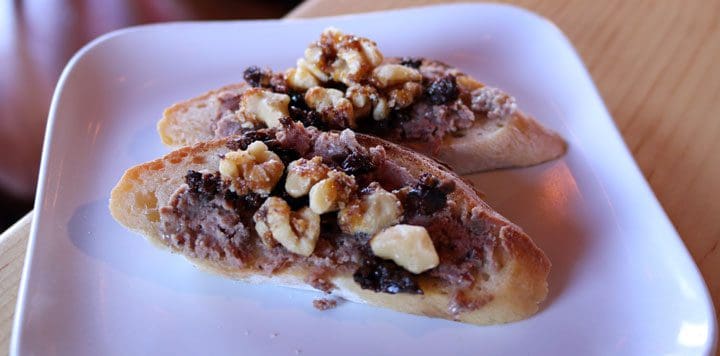 22 October 2017: Though the menu offers a buffalo pâté (house buffalo-heart pâté, tapenade and candied pecan on a baguette), my Kim asked instead for duck pâté, a Chicago area favorite. “Wait,” you ask, “didn’t Chicago ban pâté a few years ago?” Close, but no cigar. The Chicago City Council actually banned foie gras, a decision Mayor Richard M. Daley called “the silliest law that they’ve ever passed.” And yes, there is a difference between pâté and foie gras, which is actually a popular form of pâté. Pâté is actually French for “pie,” but it’s quite simply a mixture of seasoned ground seafood, poultry, meat or vegetables, and often a combination of several different base ingredients. Duck pâté is terrific on its own. With the addition of a sweet-tangy tapenade and candied pecans, it’s certainly not the “livery” taste you might expect. Instead, its flavor profile is a mild combination of duck seasoned very well. It’s spread generously on a baguette and will spread delight all over your face.