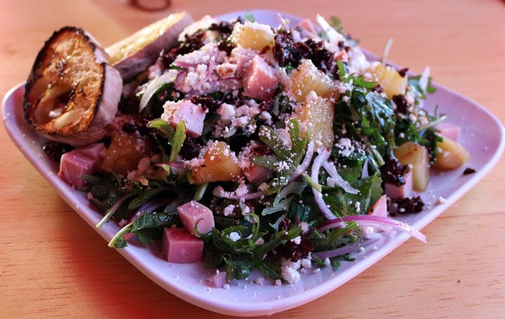 No ordinary ham graces the salad; it’s rosemary ham which melds the sweet, salty, smokiness of ham with the fresh, piney flavor of rosemary. Nor is the pineapple your garden variety pineapple; it’s pickled pineapple with discernible ginger notes (all pineapple should be pickled with ginger). An olive tapenade gives the salad an umami intensity while feta cheese crumbles lend a sharpness which contrasts well with the apple and sweet pepper vinaigrette. Red onions and kale, that ubiquitous leafy green vegetable you either hate or love, are perhaps the most common salad ingredient on the plate. As with all great salads, this is a medley of ingredients which come together so very well.