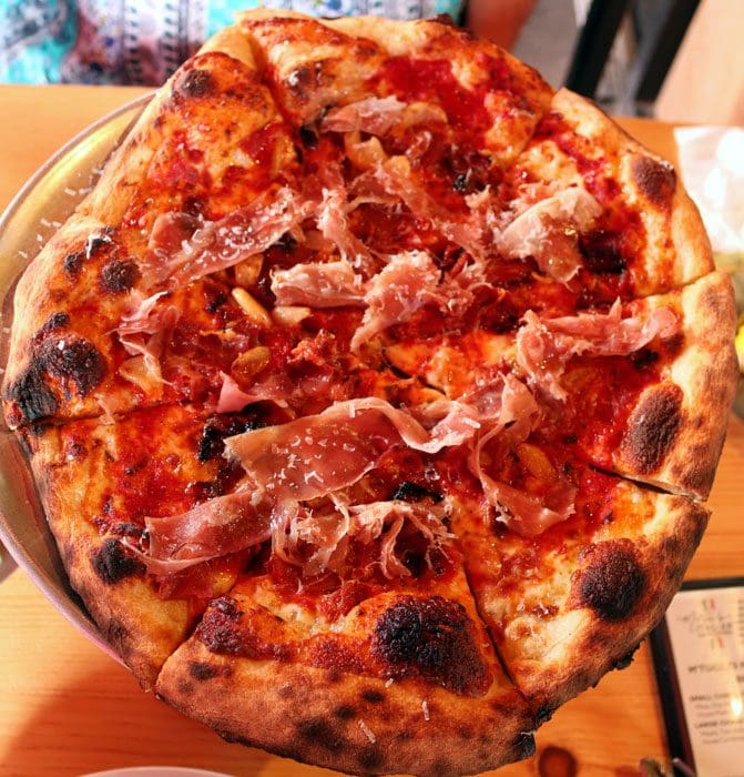 M’tucci’s The Artisan pizza (San Marzano tomato sauce, sliced mozzarella, house-cured pancetta, house capiccola, shaved Parma prosciutto) is an Italian meat-lovers bonanza showcasing some of our favorite salume cuts, all delicious. The San Marzano tomato sauce with its rich flavor, mild acidity and tasty personality is the perfect foil for the salty meats, generously proportioned so there’s meat in virtually every bite. That characteristic M’tucci’s char is the perfect canvas for a pizza which truly earns its name.