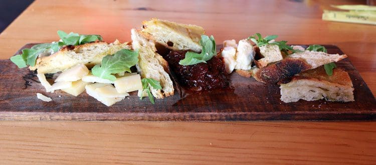 I chose a Salumi for which I paired (appropriately) thin slices of tasty Prosciutto with dime sized slivers of Chorizo. The latter were tasty but not as spicy as had elsewhere, but readily “enhanced” with the nicely tangy “mustard” accompaniment. Indeed, while the jam is a treat to be prized, I thought the bread, not the crust, was a bit too crusty. As I ordered ‘to go’, they set a nice presentation in the box. If I had Prosciutto again, I’d ask they ‘quarter’ the 10-12 inch slices for daintiness for finger-dining. Hadn’t realized the weather had chilled as boards might be fun while nibbling on my patio squirting some wine from a Bota Bag, e.g. http://tinyurl.com/l5zrxvg , while re-reading some Hemingway, e.g. http://tinyurl.com/q5uqsr8