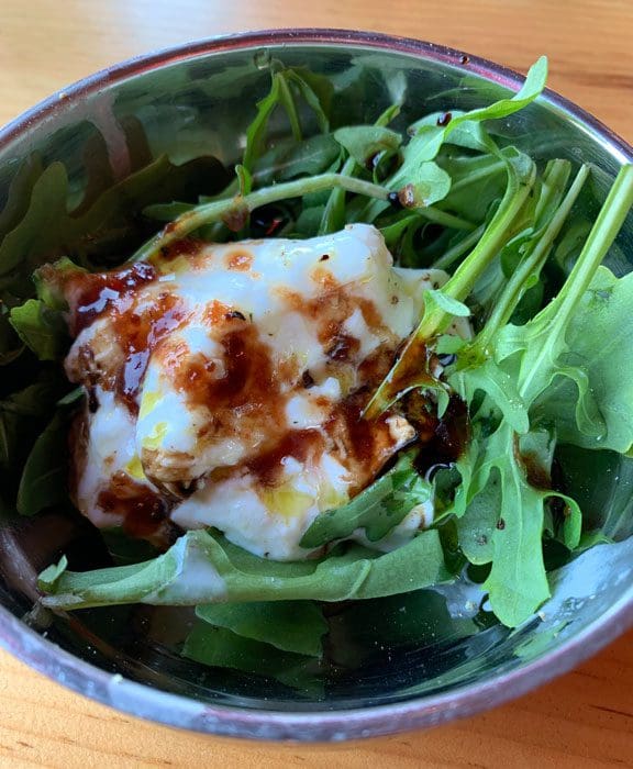 Among the cicchetti is one showcasing burrata, the unnaturally soft and moist fresh Italian cheese made from cream and mozzarella. Nestled on a bed of fresh, crisp arugula, the burrata is spritzed with a glistening Balsamic and strawberry glaze combination which impart tangy and sweet notes that counterbalance the peppery arugula and salty burrata. This cicchetti highlights the versatility of burrata, increasingly one of the most popular cheeses offered at Italian restaurants.