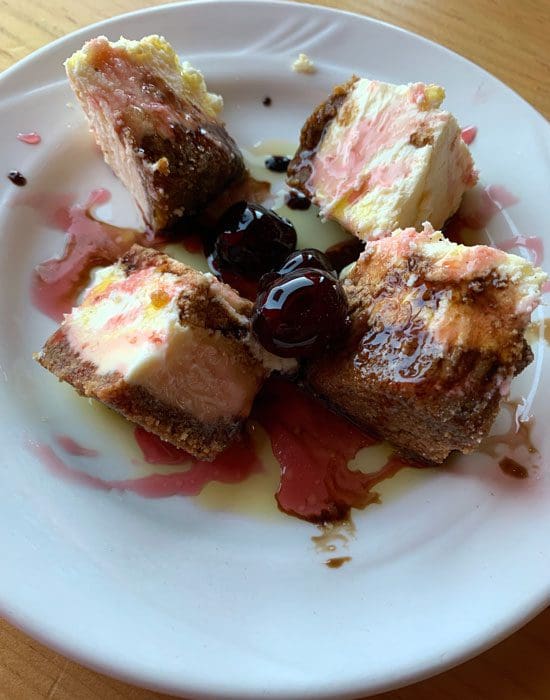 Those chocolate covered cherries came to mind when our server delivered the cheesecake we ordered. In between the four wedges of rich, decadent cheesecake drizzled with basil oil and ten-year vinegar, were four cherries as sweet as those Grandma Piedad disdained so much. She would probably have tossed out the entire dessert. Thankfully we didn’t. The cheesecake has the characteristic sour qualities we so love about cream cheese punctuated by basil oil and ten-year vinegar. It’s a unique interpretation of one of America’s most popular desserts.