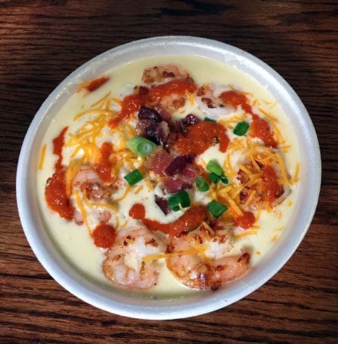 20 December 2014: The South takes its grits very seriously–so much so that unbeknownst to Yankees and those of us not blessed to have been born in the South, there are ten commandments of grits. One of the principle commandments considers it blasphemous to eat Cream of Wheat and call it grits. The Supper Truck’s grits are every bit as good as the best grits we enjoyed while living on the Mississippi Gulf Coast for nearly eight years. These gourmet-quality grits are made with grilled shrimp, bacon, roasted red pepper coulis, green onion, parsley and white wine cream sauce over creamy stone-ground South Carolina grits. They’re so good even Yankees will enjoy them.