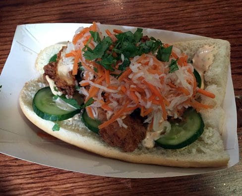 20 December 2014: While the Old South tends to hold fast to tradition, the contemporary South has embraced change, particularly in the culinary arena. At the forefront of this evolution is the city of Charleston, South Carolina (where Amy cut her teeth) which has become a bastion of culinary expansiveness. Though Charleston has a very vibrant Vietnamese culinary community, it’s unlikely they’ve seen anything like The Supper Truck’s South Carolina meets Vietnam offering of a fried chicken banh mi. Yes, a fried chicken banh mi. The canvas for this unlikely but uncommonly delicious sandwich is a fresh, locally-baked baguette into which are piled-on house-seasoned fried chicken, pickled daikon and carrots, cucumber, jalapeño, cilantro and a housemade momo sauce of Sriracha, mayo and lime juice. It’s one of the best banh mi we’ve ever had. Ever! Anywhere!