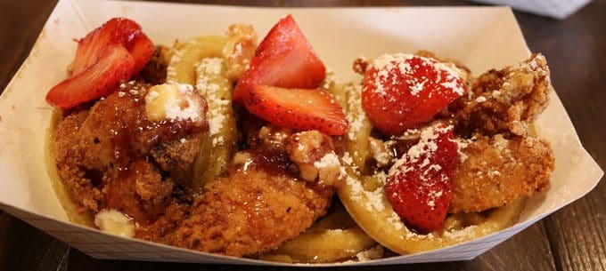 26 November 2016: John T. Edge, the director of the Southern Foodways Alliance and author of Fried Chicken: An American Story calls chicken and waffles “a Southern dish once or twice removed from the South,” meaning it’s “a dish most popular among Southerners now living in urban areas.” Though the unlikely combination of fried chicken and waffles was popularized largely in restaurants throughout Los Angeles and New York City, today that pairing can be found virtually everywhere–even in food trucks. It should come as no surprise that the Supper Truck’s version is terrific even if served on a paper vessel. Available in quantities of two each pieces of chicken and waffles, this terrific twosome will make a Southerner of us all. Though the fried chicken is boneless, it is still quite good with a crispy, golden hue sheathing tender white meat. The waffles are roundish and on the small side. They’re slathered with peach butter and syrup dusted with confectioners sugar and topped with strawberries.
