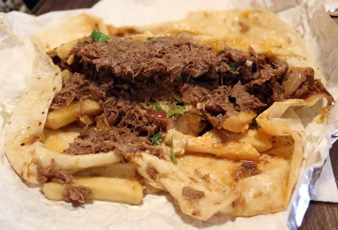 26 November 2016: Spanish-speaking New Mexicans tend to ascribe small size, youth, affection or contempt to objects and people by appending their names with the suffix “ito.” A short man named Juan, for example, might be called Juanito. We had to wonder what the heck a “borachito” might be. Being that a drunk is a borracho, could a borachito be a small drunk (and why is it spelled with only one “r”? It turns out a borachito is a deliciously different burrito (unwrapped below) constructed on a large flour tortilla engorged with Coca Cola braised New Mexico beef with rich Vietnamese flavors, Cheddar, fries, sriracha sour cream and cilantro. The diminutive terminology is out-of-place considering the size of this behemoth. Its size is matched only by the flavorful melange with sweet, savory, tangy and piquant profiles. Very much in evidence on the beef, in particular, are bold Vietnamese flavors. The fries are an interesting foil which works very well with other ingredients.