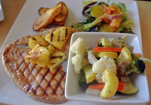 8 January 2015: The special of the day during our inaugural visit was a pechuga a la plancha (grilled chicken breast) served with plantains, a salad and a plate of sauteed vegetables. Topped with grilled pineapple which provides a sweet contrast, the exceptionally moist and tender grilled chicken breast is simple yet remarkably tasty. A simple salad (mixed greens, tomatoes, cucumbers) with a sweet-spicy mango-mustard dressing pairs well with the chicken breast as do sauteed vegetables (carrots, cauliflower, broccoli, squash).
